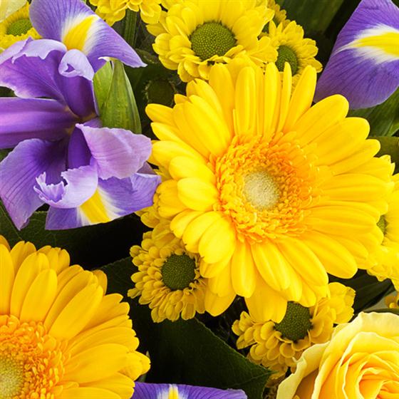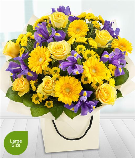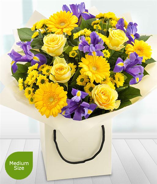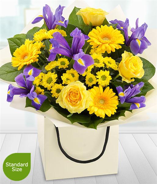Bright, bold and beautiful. The gorgeous purple Irises in this gift bag bouquet simply zing against the bright yellow Roses, Germini and Spray Chrysanthemums.