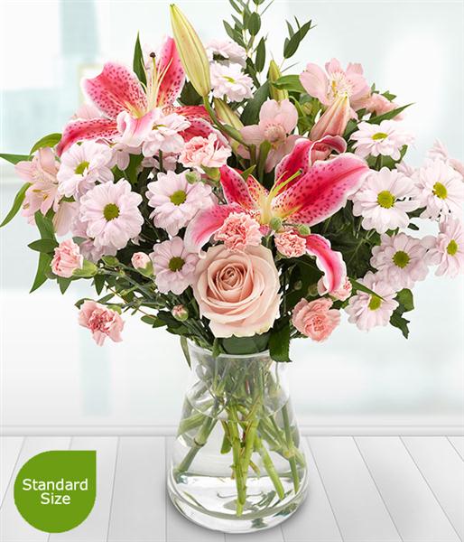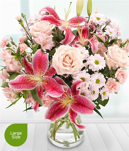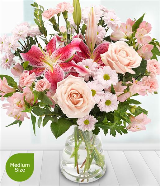 A wonderfully versatile and incredibly pretty pink bouquet featuring Roses, Lilies and Alstroemeria married with Spray Carnations and Chrysanthemums.