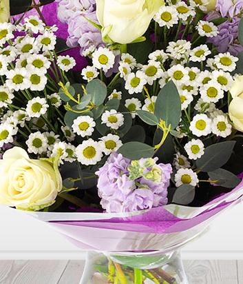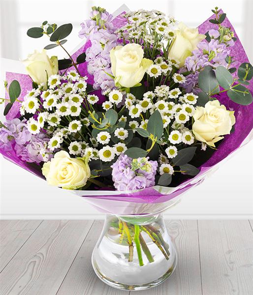 A scented country garden bouquet featuring Athena Roses, lilac Stocks and pretty white Madiba.