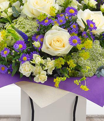 A pretty purple and white gift bag flower bouquet featuring white Roses, antirrhinum, phlox and ammi with purple veronica and mauve Aster.