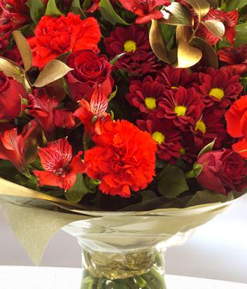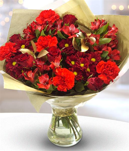 Fiery red Carnations and deep red Chrysanthemums have been perfectly married with rich red Roses, red Alstroemeria and a touch of gold Ruscus to create this stunning Christmas bouquet.