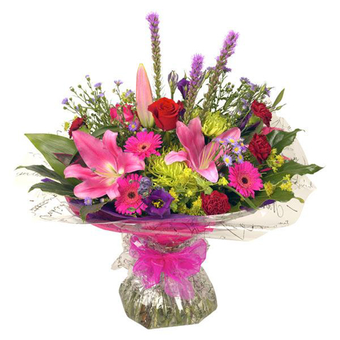 Classic and impactful, this beautiful mixed aqua handtied bouquet in bright pinks, zesty greens and complimentary foliages finished in beautiful packaging for maximum impact.