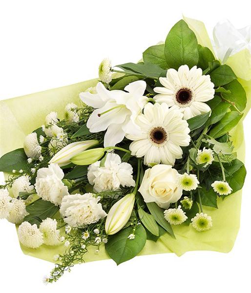 Pure white Roses, Lilies, Gerberas, Asters, Carnations and Spray Chrysanthemums have been brought together to create this simple yet stunning bouquet.