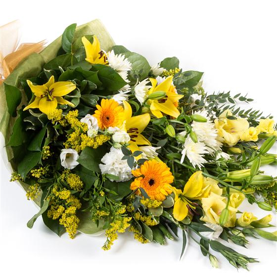 A striking selection of yellow and white blooms combined with mixed foliage make this bouquet a popular choice.