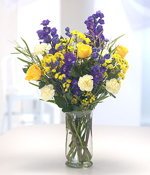 The Perfect gift - a beautifully packaged bouquet of vibrant yellow & blue flowers.