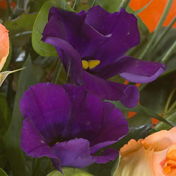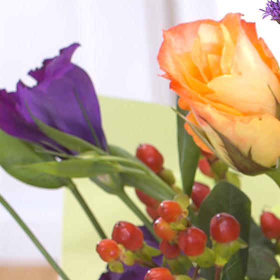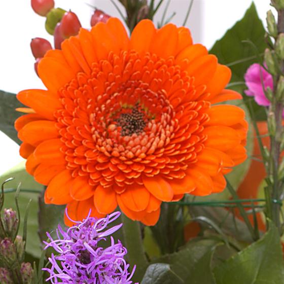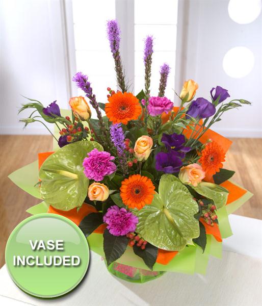 A vase full of colour - lime Anthurium, orange Gerbera and the ever popular Rose are mixed with purple Lisianthus and Liatris.