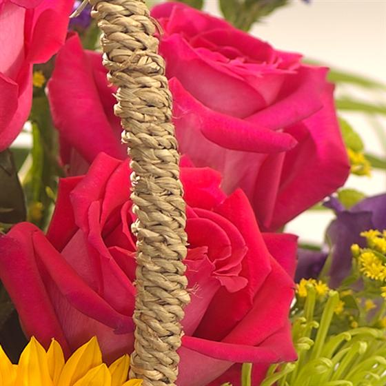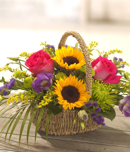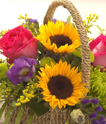A colourful, sunshine basket arrangement containing bright Sunflowers and hot pink scented Roses. A simply stunning, fuss free flower arrangement. Just add water occasionally.
