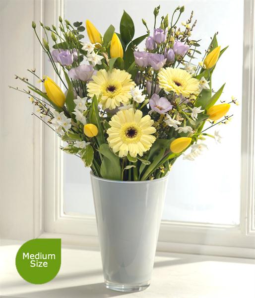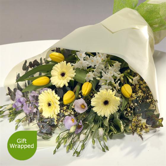A delightful spring flower bouquet in pastel shades featuring bright sunshine yellow Tulips. Lavender Lisianthus and Paperwhite Narcissi sit perfectly alongside delicate lemon Germini. A fantastically fresh and calming colour combination.