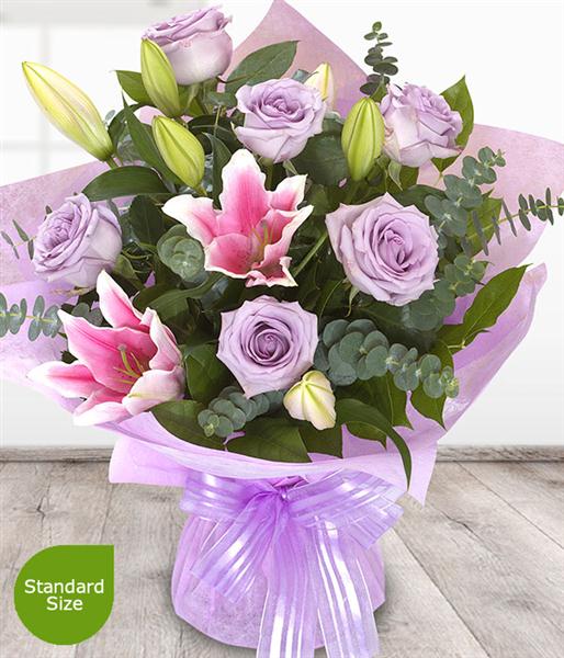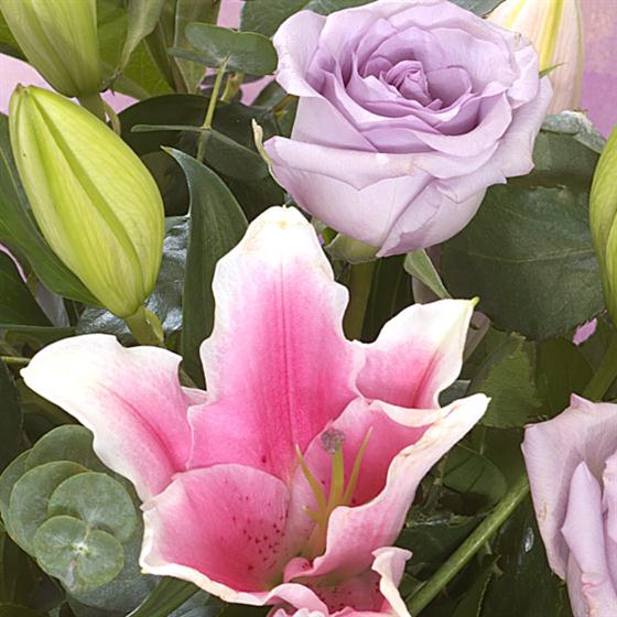 Lavender Roses and pink Lilies make this arrangement beautifully soft and gentle. A very attractive combination of gorgeous lavender Roses and pretty pink Lilies. Aqua packed for freshness, it's ready to display.