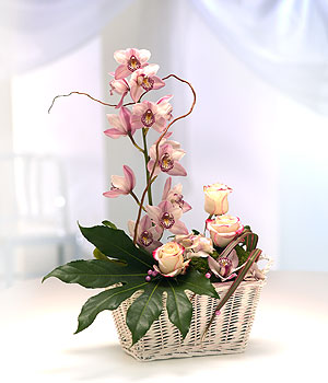 A stylish white basket arrangement containing delicate orchids, roses and foliage, finished with a top dressing of moss.