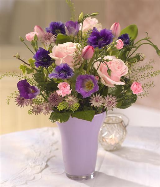 A stylish glass vase containing beautiful pink and mauve flowers featuring Roses.