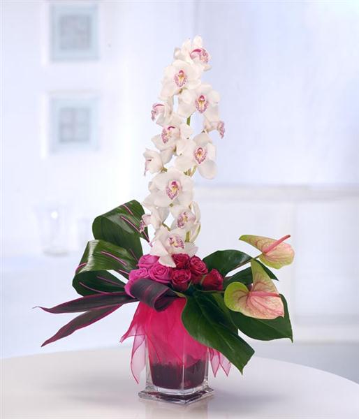 A striking pink and white modern flower arrangement featuring pink Roses, Cymbidium Orchids and Anthurium presented in a clear glass vase.