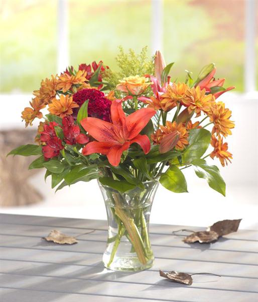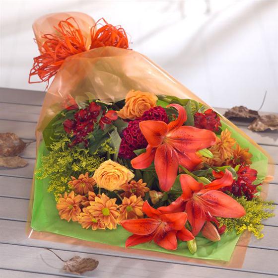 A rust red colour combination of Lilies, Roses and Chrysanthemums with a touch of Solidaster creates a glowing bouquet.