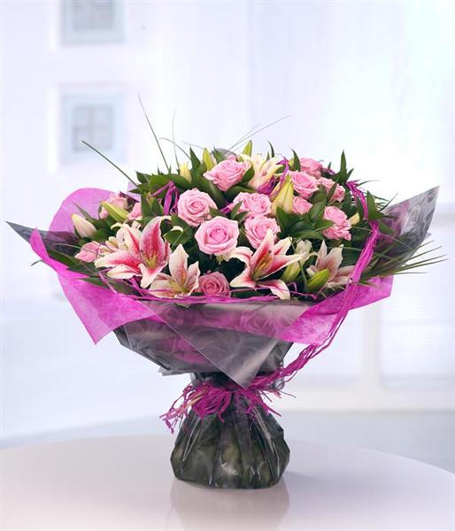 An impressive large hand-tied flower bouquet featuring pink Roses and pink Lilies complemented by rich green foliage and co-ordinating packaging. The bouquet is presented in an aquapack for instant display.
