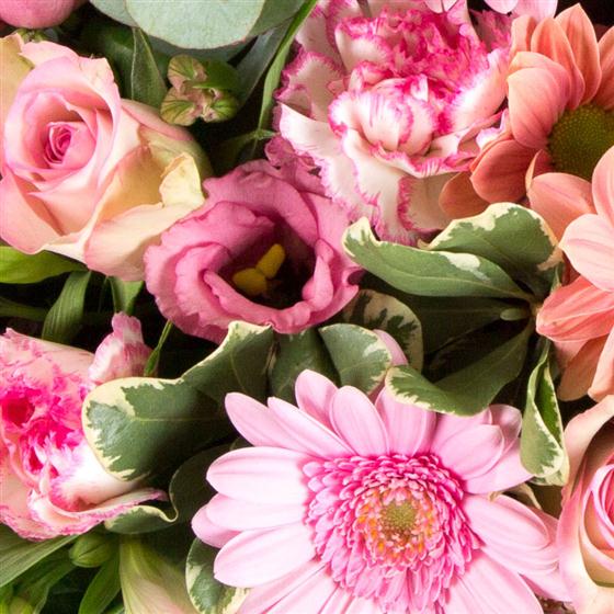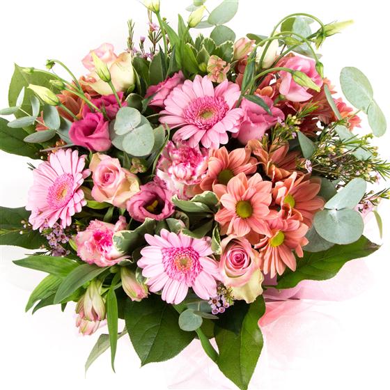 A baby pink hand-tied bouquet of roses, gerberas, alstromeria, wax flower and carnations.