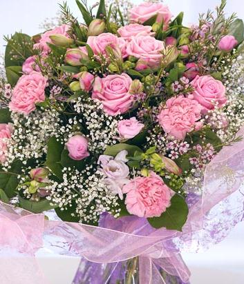 A beautifully pretty hand-tied bouquet of mixed pink flowers including pink Roses, Alstromeria, Carnations and Gypsophila. Pastel packaging complement the flowers which are supplied in an aquapack for instant display. picture shows luxury