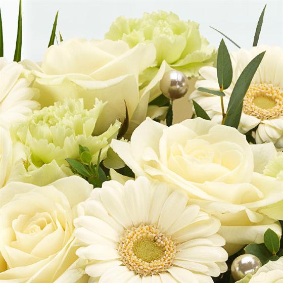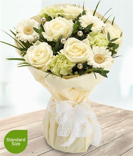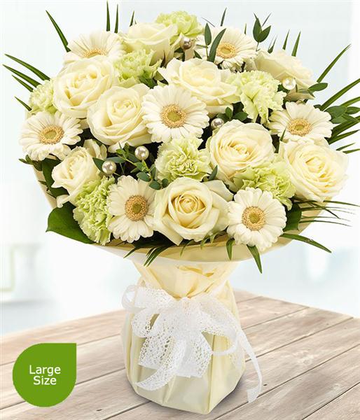 An absolutely beautiful white Rose, Germini and green Carnation bouquet with pretty pearl pins.