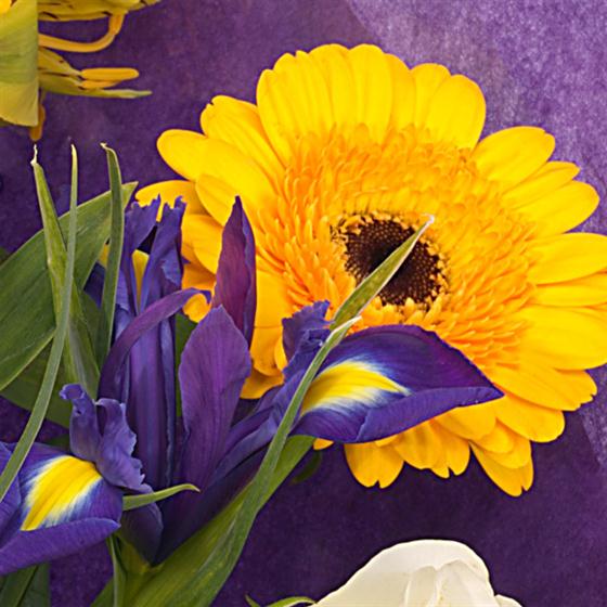 A bold yet delicately fragrant bouquet. Yellow Alstroemeria and Germinu are married perfectly with bold blue Irises. A touch of white Chrysanthmums and Eucalyptus complete the arrangement.