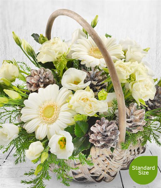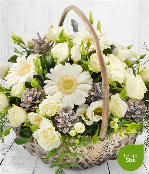 This basket is sure to put a smile on everyone's face this christmas. Using fresh stems and hand crafted to create the perfect christmas gift. This basket uses White Germini, White Spray Roses, White Lisianthus and Pine Cones to create a sparkling display.
