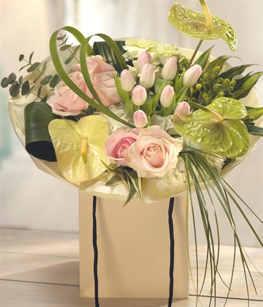 An incredible aqua pack flower gift bag packed with white Hydrangea, cream Anthurium Lilies, pink Roses and Tulips, set against a luscious green leaf backdrop. A truly impressive and fabulously fragrant Mother's Day gift.