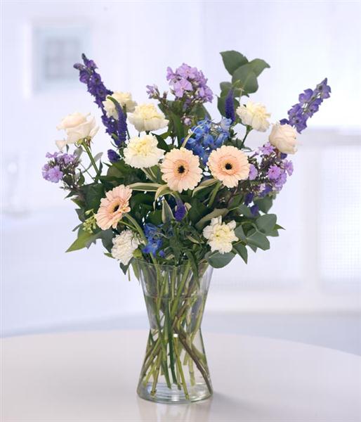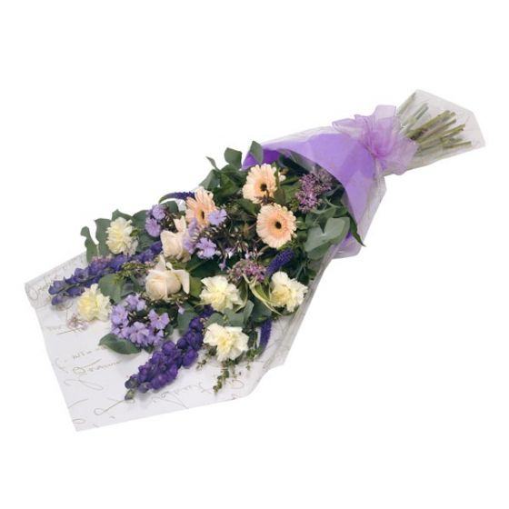 A traditional bouquet of purple and cream flowers Carnations, Mini Gerbera, Liatris, Alstromeria and Chrysanthemums, packaged for easy arrangement at home.