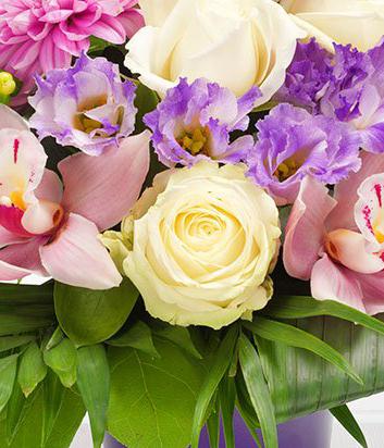 Add a touch of the tropics with this absolutely stunning flower arrangement. Pink Orchids, Roses and Dahlias with cream Roses, purple Lisianthus and gorgeous green Hypericum Berries in a purple ceramic pot.