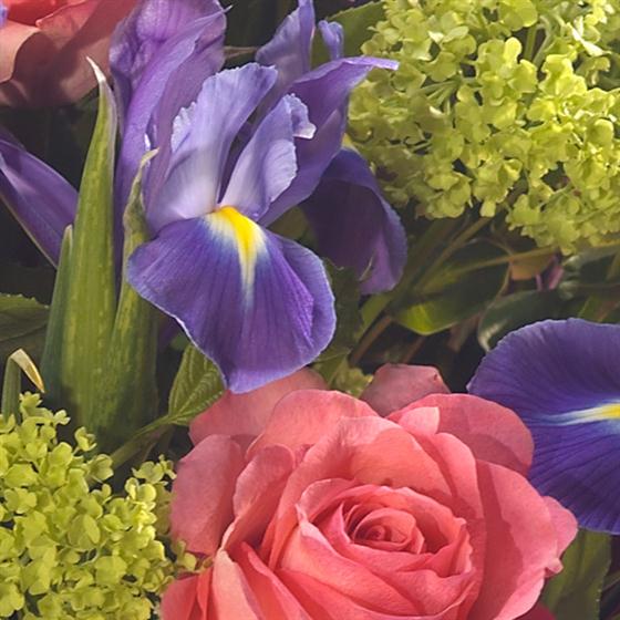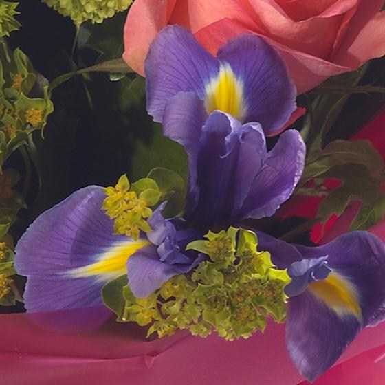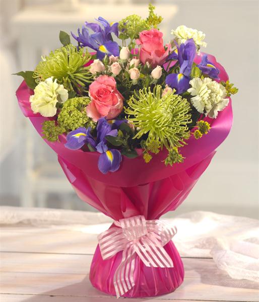 Pretty pink Roses and Irises have been beautifully combined with green Bloom Chrysanthemums and Carnations to create this simply gorgeous and delicately fragrant Mother's Day aqua pack bouquet.
