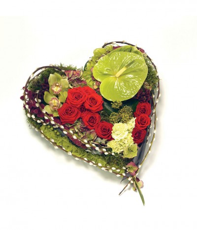 Beautiful Heart Based Tribute. Made with Red Roses, Green Anthuriums, Green Cymbidium Orchids, Red Amaranthus, Red Anigozanthos, Green Carnations, Green/Pink Hydrangea, Bun Moss, Mixed Foliage and Berries,