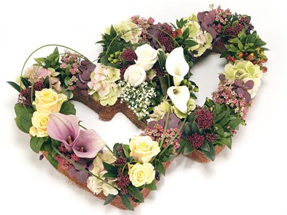 A stunning double heart shaped tribute in subtle colour scheme of pink, peach, bronze and lemon, including Lilies, Hydrangea, Roses and flowering foliage. Size: Height - 38cm (15") Width - 58cm (23").