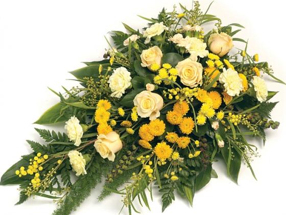 A delicate country style single ended spray, with Lemon Roses, yellow Chrysanthemums & Mimosa combined with beautiful foliage. Size: 58cm (23").