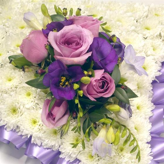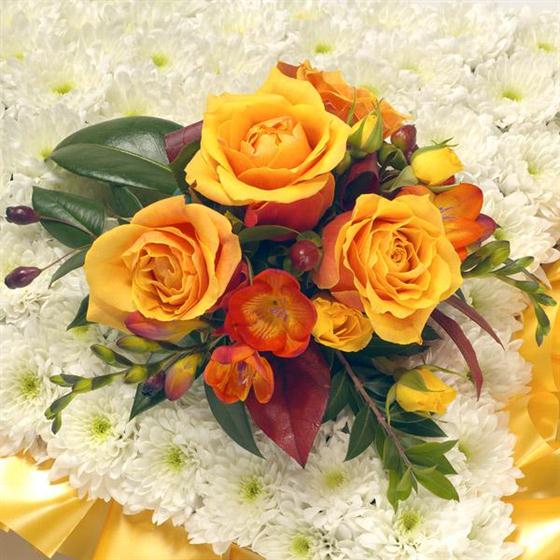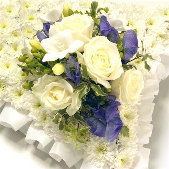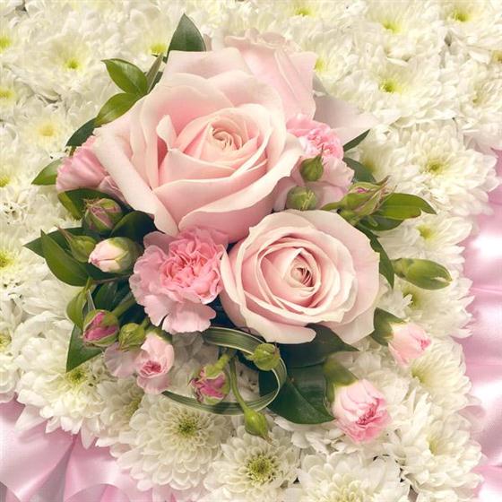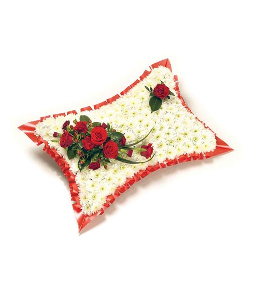 A classic white Chrysanthemum based pillow with ribbon edge. Featuring Roses, Carnations, Hypericum and complementary foliage. Size: Height - 30cm (12") Length - 47cm (18").