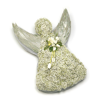 Based angel wreath - made from Gypsophila and spray of coloured silver leaves, with white Tulips and complementary foliage. Size: Height - 61cm (24") Width - 44cm (17").
