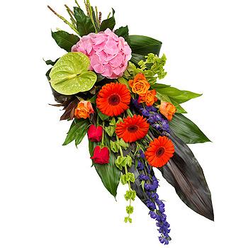 Orange and cerise Roses, purple Aconitum, pink Hydrangea, green Anthurium and orange Gerbera perfectly mixed with Molucella, red Cordyline, Aspidistra and Aralia leaves, Cocculus and red Dracaena.